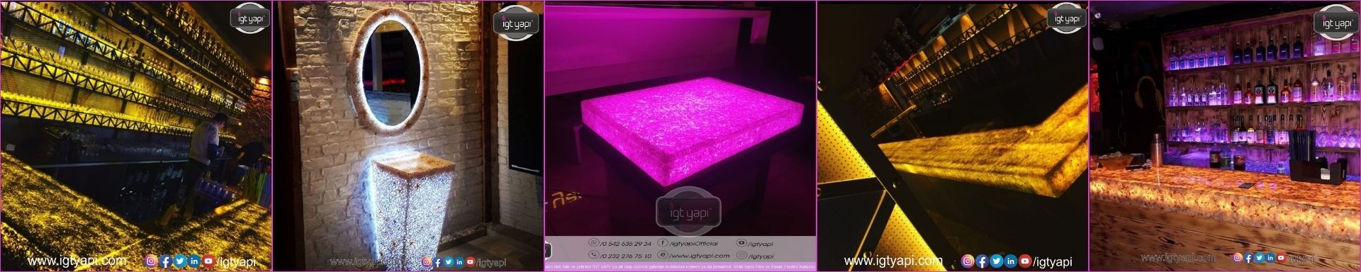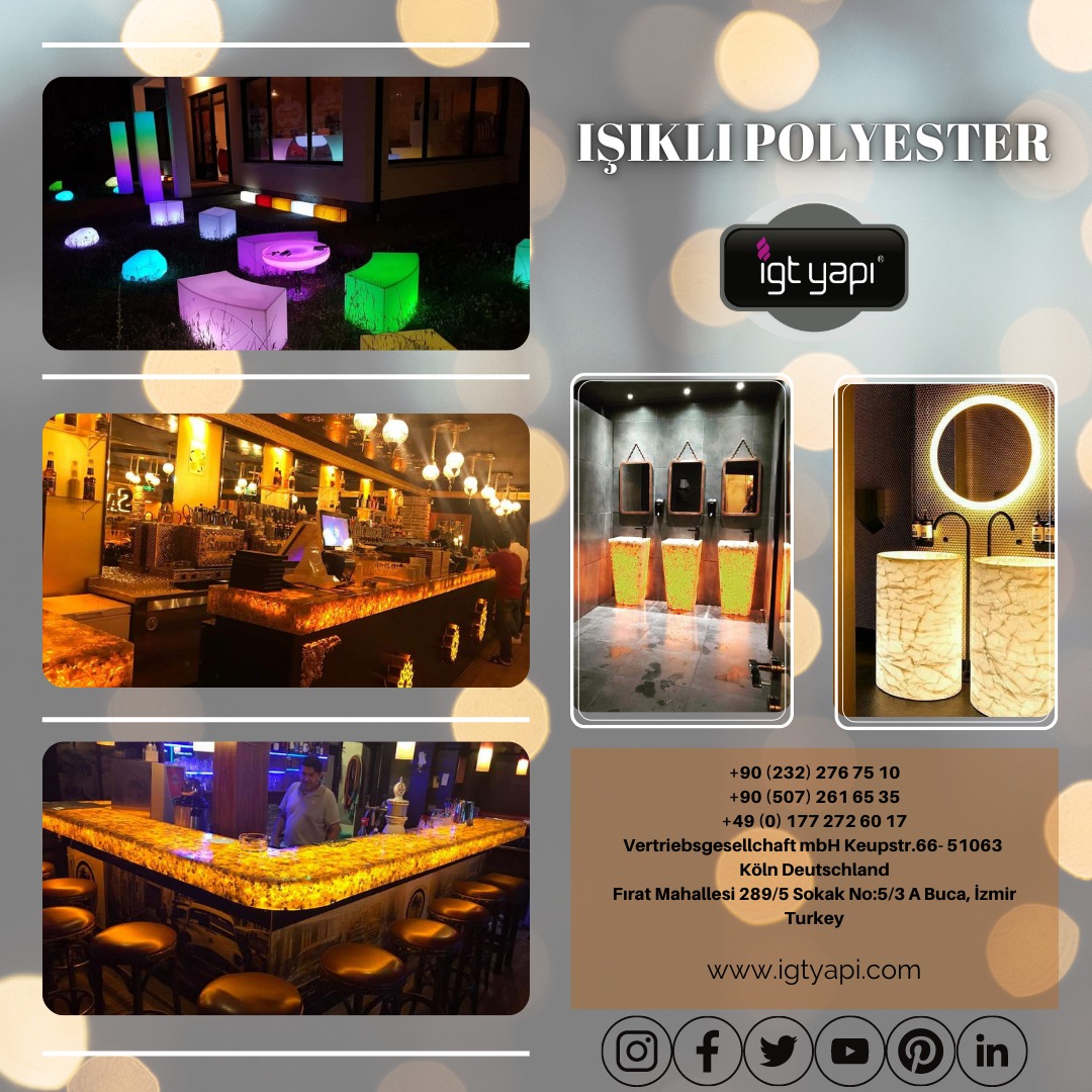 İç ve dış mekanlarınızda fark yaratacak ışıklı polyester ürünler sunuyoruz. Barlar, lavabolar, masalar ve daha fazlası, ortamınıza şıklık ve modernlik katacak şekilde tasarlandı. Yenilikçi LED teknolojisiyle aydınlatılan ürünlerimiz, mekânlarınızı büyülü bir atmosfere dönüştürmek için ideal. Hem estetik hem de fonksiyonel çözümler arıyorsanız, koleksiyonumuza göz atmayı unutmayın.